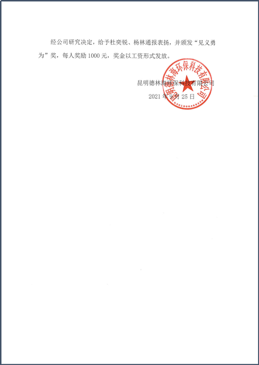 公司獲悉杜奕銳和楊林見義勇為的事跡后,對二人的行為予以了高度評價:“在他人生命面臨危險時,杜奕銳和楊林沒有選擇退縮,他們見義勇為的行為值得公司廣大員工學習。他們在挽救他人生命的同時,也為公司樹立了良好的、正面的企業形象,使得德林海人勇敢無畏、富有正義感、極具社會責任感的優秀精神品質深入人心。”并向二人頒發“見義勇為”獎,獎勵每人1000元獎金。