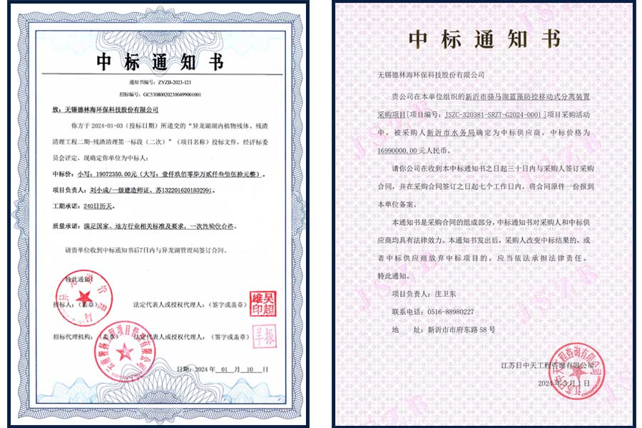 卯兔辭舊歲,辰龍迎新春,隨著2024年的到來,德林海迎來了一個雙喜臨門的開頭。新年伊始的首季,公司連續(xù)中標(biāo)異龍湖湖內(nèi)植物殘體、殘渣清理工程二期-殘渣清理第一標(biāo)段(簡稱“異龍湖清淤項目”)和新沂市駱馬湖藍(lán)藻防控移動式分離裝置采購項目(簡稱“駱馬湖項目”)。這兩個項目的中標(biāo)為德林海帶來了總計3606萬元的合同。