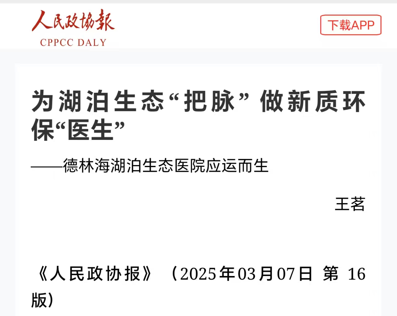 2025年3月7日,人民政協報發表文章《為湖泊生態“把脈” 做新質環保“醫生”——德林海湖泊生態醫院應運而生》,文中對德林海湖泊生態醫院自主研發的加壓控藻技術、中宇宙數字孿生診驗系統和精準清淤技術等主流藍藻治理和湖庫富營養化內源治理技術以及湖庫保護治理創新模式——績效付費模式進行了詳細報道,并盛贊以“善水者 善于水”為發展理念的德林海湖泊生態醫院是新質環保企業代表。